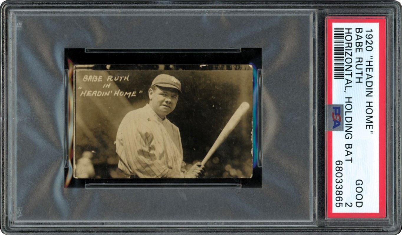 The auction also includes a 1920 Ruth card promoting a barnstorming tour headlined by Ruth after the season. This card, also scarce with only three known examples, shows Ruth in mid-swing, heading toward first base. It's graded PSA 1.5.